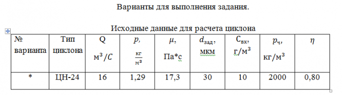 Цель работы - вычислить параметры, необходимые для выбора оборудования: - диаметр циклона 𝐷ц , м;