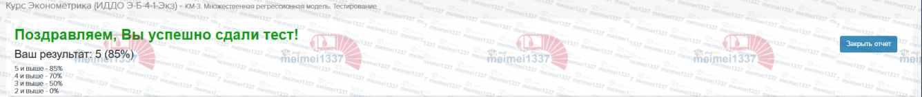 Для студентов ИДДО НИУ «МЭИ» по предмету ЭконометрикаЭконометрика - КМ-3. Множественная регрессионная модель. Тестирование - 85%Эконометрика - КМ-3. Множественная регрессионная модель. Тестирование - 85%
