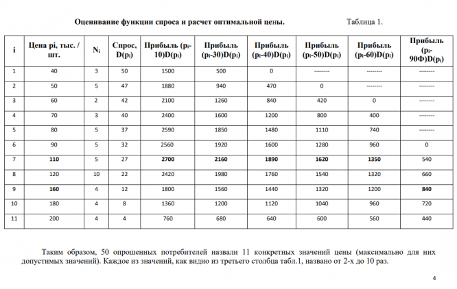 1. Оценивание функции спроса Обработка данных проводится с помощью оценивания функции спроса. Это можно сделать, построив выборочную функцию спроса графически, в виде таблицы или обработав данные с помощью метода наименьших квадратов. Рассмотрим первый метод (табличный). В результате опроса 50 человек мы получили 50 ответов в ответ на вопрос, какую максимальную цену потребитель готов заплатить за обычную молочную шоколадку. Цена колеблется от 40 руб. до 200 руб. Сначала соберем все цены. 40, 50, 60, 70, 80, 80, 110, 120,110, 80, 50, 90, 80, 50, 70, 90, 200, 80, 50, 180, 200, 40, 180, 120, 110, 120, 90, 110, 180, 60, 70, 90, 160, 200, 120, 120, 40, 120, 160, 160, 50, 120, 160, 120, 110, 120, 200, 180, 90, 120 Теперь перейдем к анализу данных опроса. Для начала необходимо составить таблицу исходных данных – пар чисел (p, D(p)), где p – независимая переменная – цена, (руб. / шт.) D(p) – зависимая от p величина – спрос(шт.). Упорядочиваем все значения в порядке возрастания. Затем строим табл.1. В первом столбце – номера различных значений цены в порядке возрастания (i). Во втором столбце приведены сами значения цены (pi). В третьем столбце указано, сколько раз названо то или иное значение (Ni)