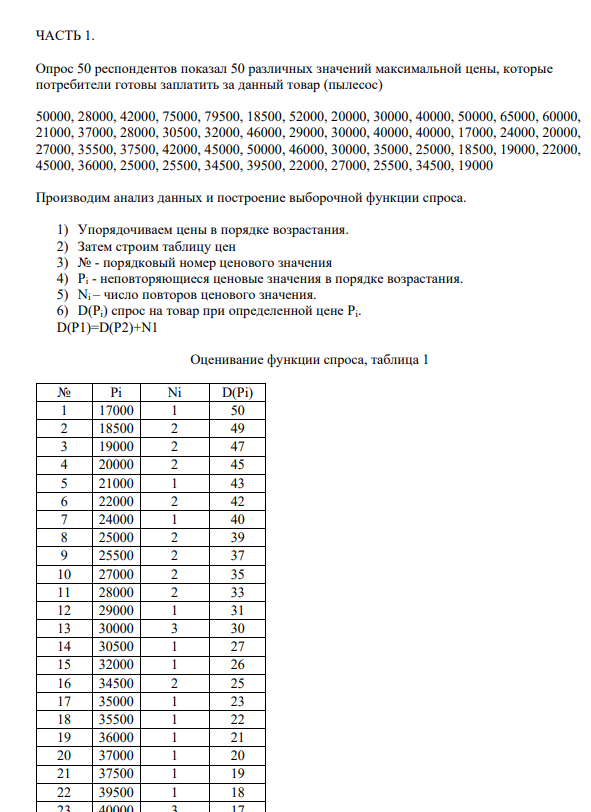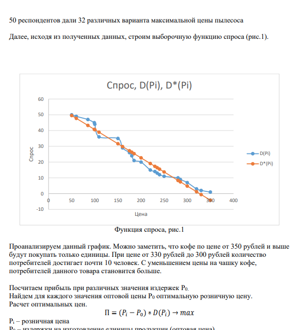 На основе данных опроса 50 выявить уровень оптимальной цены на продукт «пылесос» и построить выборочную функцию спроса