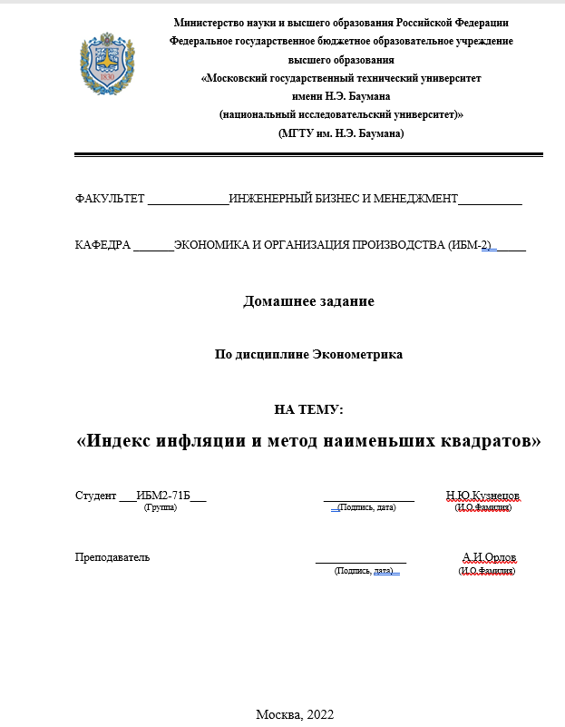 Для студентов МГТУ им. Н.Э.Баумана по предмету ЭконометрикаДомашнее задание "Индекс инфляции"Домашнее задание "Индекс инфляции"