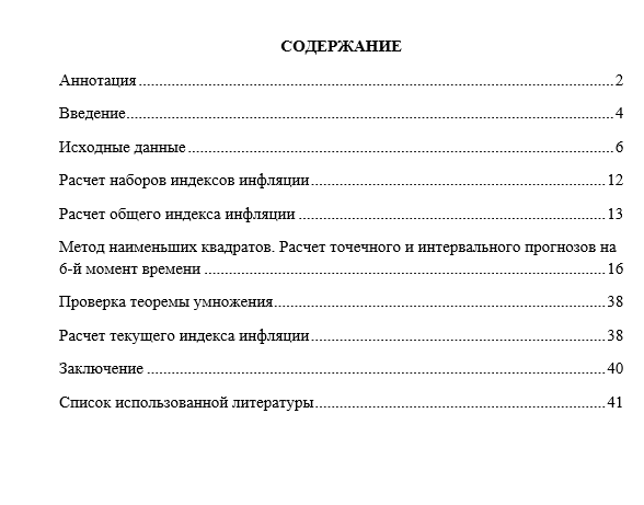 В работе выбрано и зафиксировано место сбора информации о ценах, конкретные объекты наблюдения, собраны данные по ценам за шесть моментов времени. Рассчитаны индексы инфляции для пяти моментов времени и прогнозировании по первым пяти из них шестого значения методом наименьших квадратов.