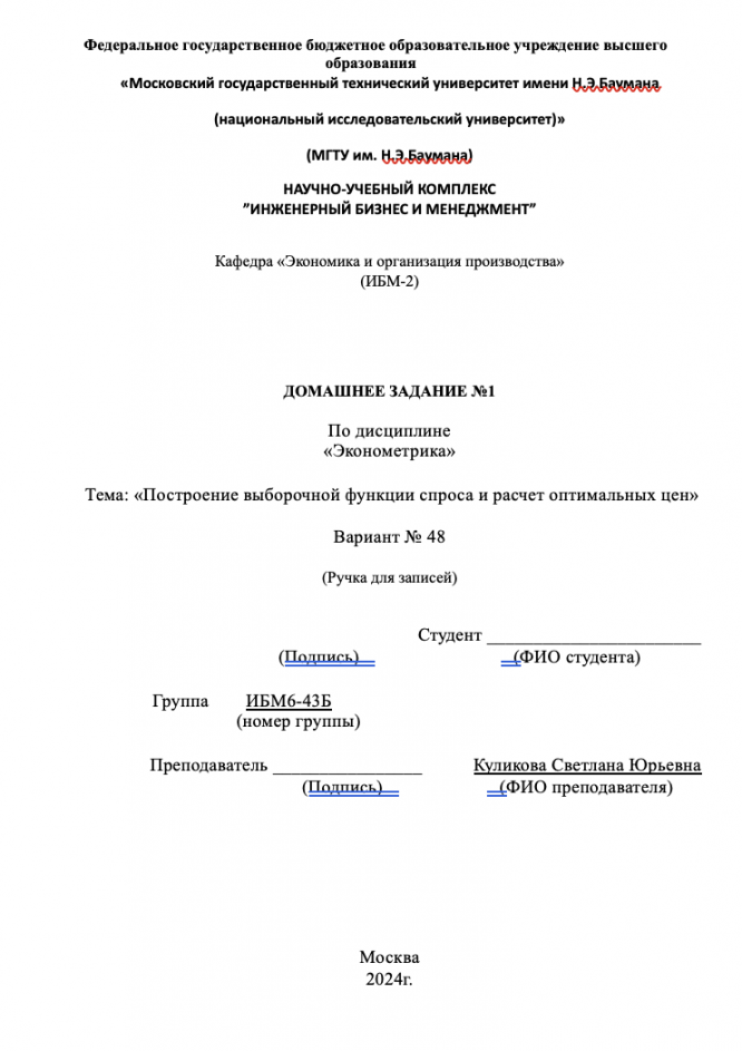 Для студентов МГТУ им. Н.Э.Баумана по предмету ЭконометрикаПостроение выборочной функции спроса и расчет оптимальных ценПостроение выборочной функции спроса и расчет оптимальных цен
