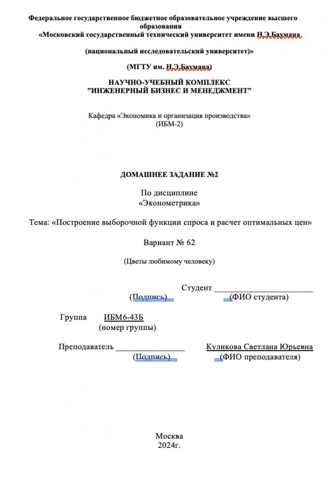 Для студентов МГТУ им. Н.Э.Баумана по предмету ЭконометрикаПостроение выборочной функции спроса и расчет оптимальных ценПостроение выборочной функции спроса и расчет оптимальных цен