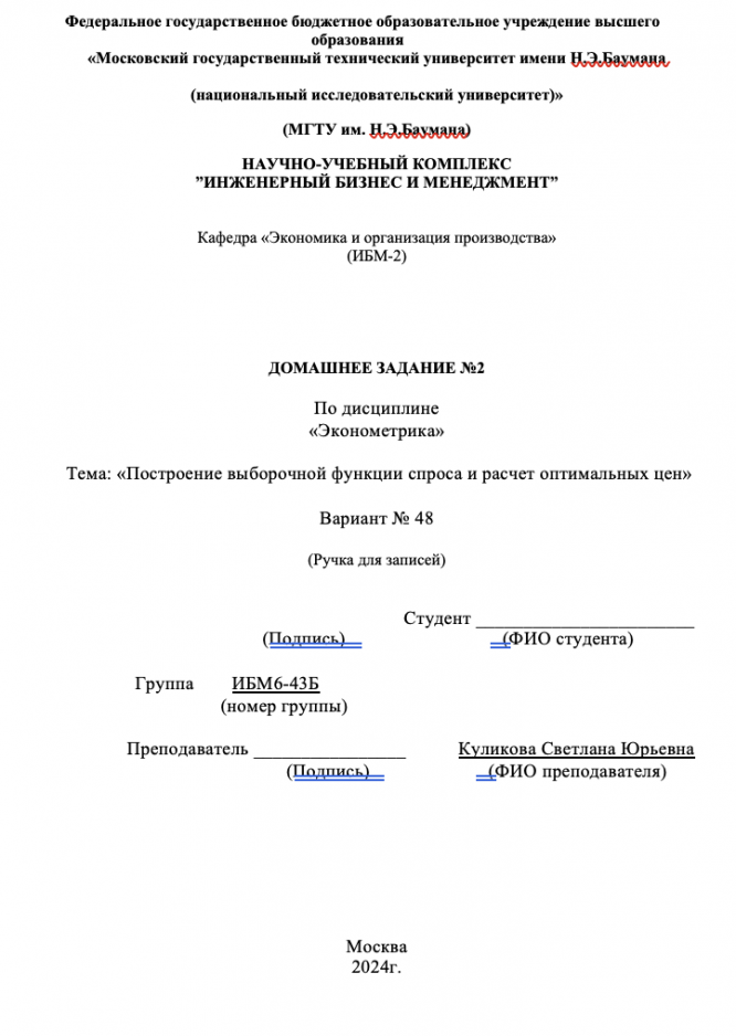Для студентов МГТУ им. Н.Э.Баумана по предмету ЭконометрикаПостроение выборочной функции спроса и расчет оптимальных ценПостроение выборочной функции спроса и расчет оптимальных цен