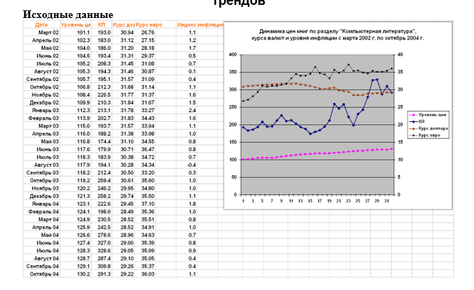 Построить графики временных рядов средней цены заданных книг, курса валют и уровня инфляции за заданный период. Для временного ряда средней цены книг построить коррелограмму и сделать вывод о структуре анализируемого временного ряда. Провести сглаживание временного ряда с помощью линейной, логарифмической, степенной, экспоненциальной и полиномиальной функций, выбрать лучшую из нелинейных функций с учетом величины коэффициента детерминации и наглядной экономической интерпретации параметров модели. При проведении расчетов использовать пакеты "Анализ данных" и Statistica. Провести тестирование заданного временного ряда на наличие структурных изменений.