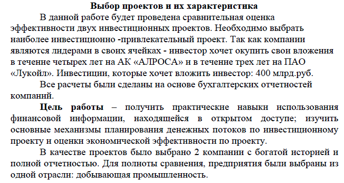 Главная » Учебные материалы » Экономическая оценка инвестиций » Домашние задания » МГТУ им. Н.Э.Баумана » 8 семестр » Домашнее задание "Сравнительная оценка инвестиционных проектов АК "Алроса" и "Лукойл"