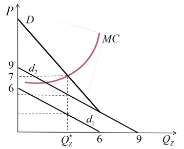 На рынке общественного блага существуют два потребителя. На рисунке представлены кривая предельных издержек, кривые спроса на благо двух субъектов и кривая рыночного спроса.