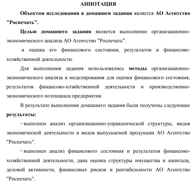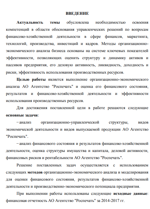 Целью работы является выполнение организационно-экономического анализа АО Агентство "Роспечать" и оценка его финансового состояния, результатов и финансово-хозяйственной деятельности и эффективности использования производственных ресурсов.
