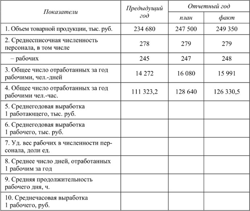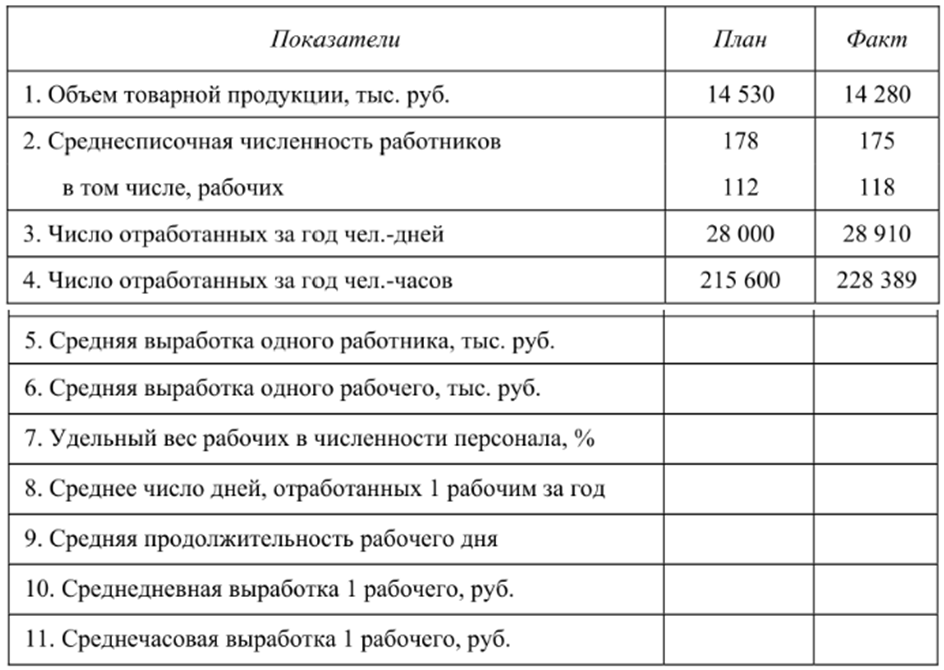 Данные: Объем товарной продукции по плану равен 850 тыс. руб., по отчету — 925 тыс. руб. Численность рабочих планировалась на уровне 45 человек, фактически составила — 48 чел.