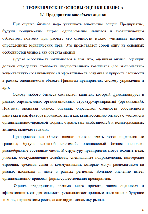 Особое место среди объектов оценки занимает бизнес (предприятие, организация, компания). Оценкой бизнеса принято называть рыночную стоимость предприятия как хозяйствующего субъекта, со всей совокупностью принадлежащих ему прав и обязательств. Данная процедура включает в себя глубокий технологический, финансовый и организационный анализ деятельности компании и потенциала её развития. При оценке бизнеса объектом выступает деятельность, направленная на получение прибыли и осуществляемая на основе функционирования имущественного комплекса предприятия. Актуальность темы обусловлена тем, что при купле-продаже или реструктуризации предприятия потребность в оценке возникает во избежание споров о стоимости имущества предприятия (основных и оборотных средств) или бизнеса в целом с учетом его доходности в краткосрочном периоде и долгосрочной перспективе. Еще на стадии создания предприятия независимая оценка может быть полезна при внесении имущества в уставный капитал. Так как деятельность оценщика регламентируется законодательством, отчет об оценке имеет юридическую силу и указанные в нем результаты определения стоимости могут быть использованы в суде при возникновении каких-либо имущественных споров, в частности относительно уставного капитала. В процессе функционирования практически каждого предприятия необходима независимая оценка для управления финансами. Особенно эффективно используется оценка при кредитовании: отчет об оценке является необходимым документом для получения кредитов под залог имущества.