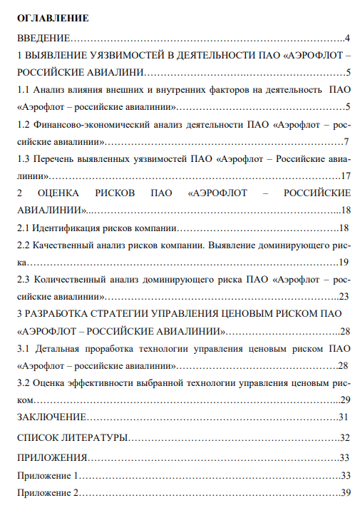 В постоянно меняющихся и нестабильных условиях рыночной экономики компании могут подвергаться воздействию всевозможных опасностей и рисковых событий. Их своевременные выявление, оценка и ликвидация являются одними из ключевых факторов успешности фирмы. Актуальность данной курсовой работы заключается в том, что в нынешних условиях мир столкнулся с одним из самых серьёзных за последнее время экономических кризисов, который влечёт за собой различные серьёзные опасности и риски. Большинство компаний не могут «выжить» в этих суровых условиях, во многом из-за недостаточно хорошей системы рискменеджмента в них. Целью данной работы является разработка технологии управления ценовым риском ПАО «Аэрофлот – российские авиалинии». Для достижения этой цели требуется решить следующие задачи: 1) выявить риски, которым подвержено ПАО «Аэрофлот – российские авиалинии» при помощи методов всестороннего анализа его деятельности; 2) на основании специфических методик оценить выявленные риски и выявить доминирующий риск; 3) разработать стратегию управления выявленным доминирующим риском и оценить её эффективность