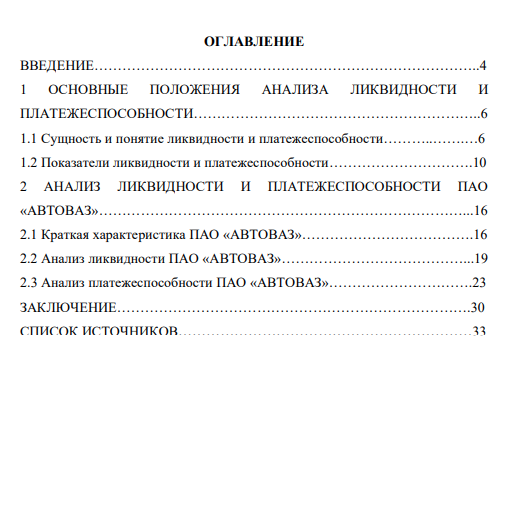 Целью данной работы является оценка ликвидности и платежеспособности предприятия на основе теоретического изучения методики выполнения анализа ликвидности и платежеспособности и практического выполнения данного анализа конкретного предприятия. В соответствии с поставленной целью в ходе работы необходимо решить следующие задачи:  раскрыть теоретические аспекты анализа ликвидности и платежеспособности;  провести анализ финансовых коэффициентов ликвидности и платежеспособности ПАО «АВТОВАЗ»; 5  изучить финансовое состояние ПАО «АВТОВАЗ» на основе проведенного анализа;  подвести итоги.