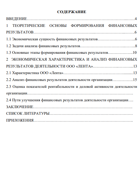 Целью данной курсовой работы является рассмотрение теоретических основ анализа финансовых результатов на примере деятельности конкретного предприятия, а так же предложение мероприятий по улучшению финансовых результатов. Для достижения этой цели требуется решить следующие задачи: − изучить теоретические основы формирования финансовых результатов; − охарактеризовать деятельность анализируемой организации ООО «Лента»; − проанализировать рентабельность и финансовые результаты деятельности ООО «Лента»; 5 − предложить мероприятия по улучшению финансовых результатов деятельности компании. Объектом исследования является организация ООО «Лента». Предметом исследования является анализ финансовых результатов деятельности предприятия. Информационно-аналитической базой исследования является годовая бухгалтерская отчетность ООО «Лента» за 2017-2019 гг.