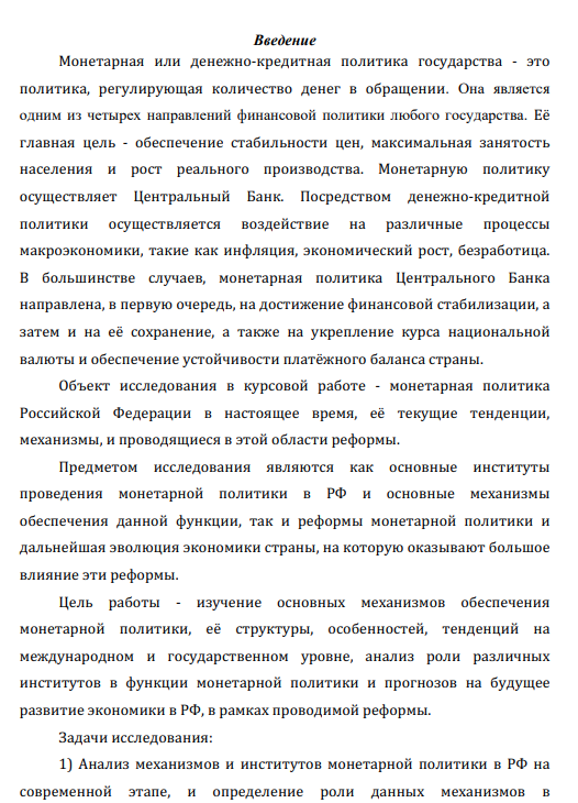 Предметом исследования являются как основные институты проведения монетарной политики в РФ и основные механизмы обеспечения данной функции, так и реформы монетарной политики и дальнейшая эволюция экономики страны, на которую оказывают большое влияние эти реформы. Цель работы - изучение основных механизмов обеспечения монетарной политики, её структуры, особенностей, тенденций на международном и государственном уровне, анализ роли различных институтов в функции монетарной политики и прогнозов на будущее развитие экономики в РФ, в рамках проводимой реформы. Задачи исследования: 1) Анализ механизмов и институтов монетарной политики в РФ на современной этапе, и определение роли данных механизмов в 6 регулировании тенденций и общей экономической ситуации, касающейся денежно-кредитной политики; 2) Изучение структуры механизмов обеспечения и форм реализации монетарной политики, выявление основных тенденций и направлений развития; 3) Анализ проведенных и проводимых реформ монетарной политики, их основных направлений и итогов, а также изучение различных прогнозов эволюции экономики РФ в рамках проводимой реформы монетарной политики. Методологическую основу исследования в курсовой работе составили научные труды выдающихся отечественных и зарубежных экономистов и социологов, нормативные документы и статистические данные. Для решения поставленных задач использовались следующие методы исследования: теоретический анализ, индуктивный метод, изучение литературы, сравнение и другие
