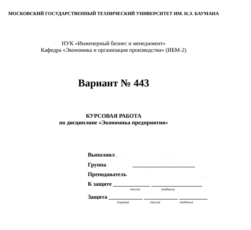 Для студентов МГТУ им. Н.Э.Баумана по предмету Экономика предприятияКурсовая работа - Вариант № 443Курсовая работа - Вариант № 443