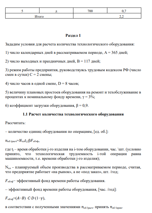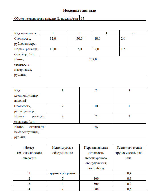 Цель курсовой работы- освоение системы экономических показателей, характеризующих деятельность предприятия на конкретном примере, изучение взаимосвязи технических характеристик изготавливаемых деталей, состояния, производственных мощностей, качества используемых ресурсов. Выполнение первого раздела предполагает: – расчет потребности в основных и оборотных средствах на базе исходной информации об условном изделии Б, включающей нормы расхода и цены основных материалов и комплектующих изделий, технологическую трудоемкость отдельных операций, планируемый объем производства, первоначальную стоимость необходимого оборудования; – расчет численности персонала и фонда оплаты труда; – формирование сметы затрат на производство; – расчет полной себестоимости продукции; – составление баланса хозяйственных средств предприятия на начало периода; – расчет планируемой и фактической цены изделия; – составление отчета о прибылях и убытках по плановым и фактическим данным; – формирование планового и фактического баланса хозяйственных средств на конец периода; – расчет плановых и фактических значений основных показателей хозяйственной деятельности; 6 – анализ показателей и выводы о результатах деятельности. Выполнение второго раздела предполагает: – расчет дополнительных потребностей в оборудовании, персонале, материалах и комплектующих изделиях; – составление сметы затрат; – расчет и распределение косвенных расходов, составление калькуляции; – определение прироста основных и оборотных средств; – формирование бухгалтерского баланса; – установление цен на изделия А и В параметрическим методом, используя в качестве аналога изделие Б; – расчет плановой выручки от реализации; – составление отчета о прибылях и убытках; – расчет основных показателей хозяйственной деятельности; – описание результатов технико-экономического обоснования и принятого решения.
