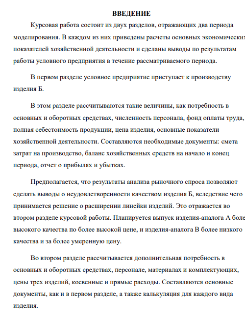 В рамках курсовой работы разрабатывается упрощенная финансовоэкономическая модель условного производственного предприятия. Работа позволяет выявить наиболее рациональный способ использования ресурсов, снизить затраты, увеличить показатели эффективности. В процессе выполнения курсовой работы осваиваются такие необходимые навыки, как планирование производственных ресурсов, анализ затрат, составление документации. Так, на основании произведенных расчетов, формируются баланс хозяйственных средств предприятия на начало и конец рассматриваемого периода, смета затрат на производство, калькуляция себестоимости, отчет о прибылях и убытках, штатное расписание.