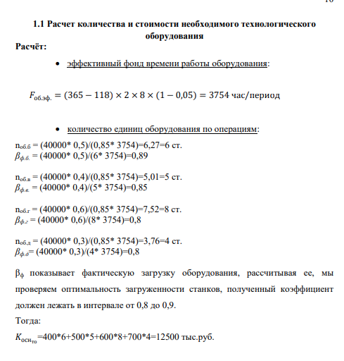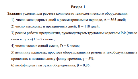 Зададим условия для расчета количество технологического оборудования: 1) число календарных дней в рассматриваемом периоде, А = 365 дней; 2) число выходных и праздничных дней, В = 118 дней; 3) режим работы предприятия, руководствуясь трудовым кодексом РФ (число смен в сутки) С = 2 смены; 4) число часов в одной смене, D = 8 часов; 5) величину плановых простоев оборудования на ремонт и техобслуживание в процентах к номинальному фонду времени, γ = 5%; 6) коэффициент загрузки оборудования, β = 0,85.