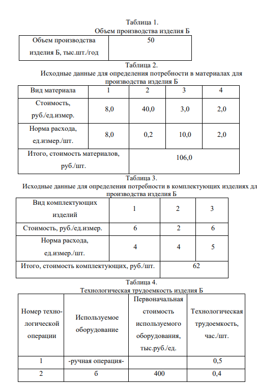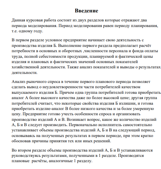 Данная курсовая работа состоит из двух разделов которые отражают два периода моделирования. Период моделирования равен периоду планирования, т.е. одному году. В первом разделе условное предприятие начинает свою деятельность с производства изделия Б. Выполнение первого раздела предполагает расчёт потребности в основных и оборотных ,численности персонала и фонда оплаты труда, полной себестоимости продукции, планируемой и фактической цены изделия и плановых и фактических значений основных показателей хозяйственной деятельности. Также анализ показателей и выводы о результатах деятельности. Анализ рыночного спроса в течение первого планового периода позволяет сделать вывод о неудовлетворенности части потребителей качеством выпускаемого изделия Б. Причем одна группа потребителей готова приобретать аналог А более высокого качества даже по более высокой цене; другая группа потребителей считает, что некоторые свойства изделия Б излишни, и готова приобретать изделие-аналог В более низкого качества и за более умеренную цену. Предприятие готово учесть особенности спроса и организовать производство изделий А и В. Возникает вопрос, какое же количество изделий А, Б и В следует производить. Первоначально исполнитель самостоятельно устанавливает объемы производства изделий А, Б и В на следующий период, основываясь на полученных результатах в первом периоде, при этом кратко обосновав причины принятия тех или иных решений. Во втором разделе объемы производства изделий А, Б и В устанавливаются руководствуясь результатами, полученными в 1 разделе. Производятся плановые расчёты, аналогичные 1 разделу.