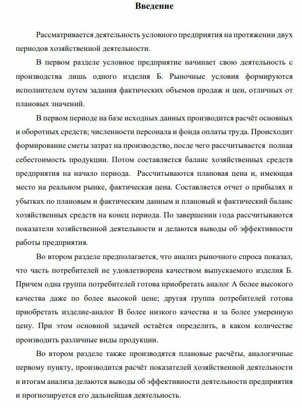 Назначение курсовой работы - изучить систему экономических показателей, характеризующих хозяйственную деятельность предприятия, и научиться взаимосвязи таких факторов, как технические характеристики изготавливаемых изделий, состояние производственных мощностей, качество используемых ресурсов, и т.п. В процессе работы составляются основные документы, такие как: баланс хозяйственных средств предприятия на начало и конец периода хозяйственной деятельности, смета затрат на производство, отчет о прибылях и убытках. Все документы и расчеты подаются в упрощенной форме – не отражается учет НДС, не учитываются некоторые статьи баланса и т.п. После получения итогов работы условного предприятия и подсчёта показателей, следуют выводы о целесообразности данной производственной программы, эффективности её компонентов, возможных коррективах и исправлениях.