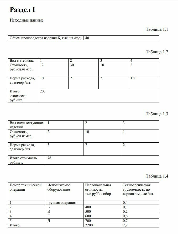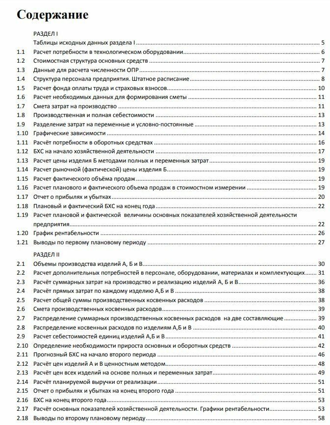 Курсовая работа состоит из двух разделов Раздел I. В первом разделе нам необходимо описать начало хозяйственной деятельности гипотетического предприятия, которое выпускает изделие Б. Мы определяем потребности в основном и оборотном капитале, человеческих и финансовых ресурсах, рассчитываем себестоимость изделия и составляем основные отчетные документы. Периодом планирования мы считаем один год. В данной работе деятельность по месяцам не рассматривается. Раздел II. Его суть состоит в том, что мы меняем производственную программу на следующий год. На этот раз предприятие, учитывая рыночный спрос, выпускает три изделия: А, Б и В — они отличаются между собой уровнем качества и ценой. Чтобы принять решения о выпуске трех изделий вместо одного, в разделе II производится расчет и анализ плановых показателей хозяйственной деятельности предприятия.