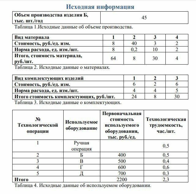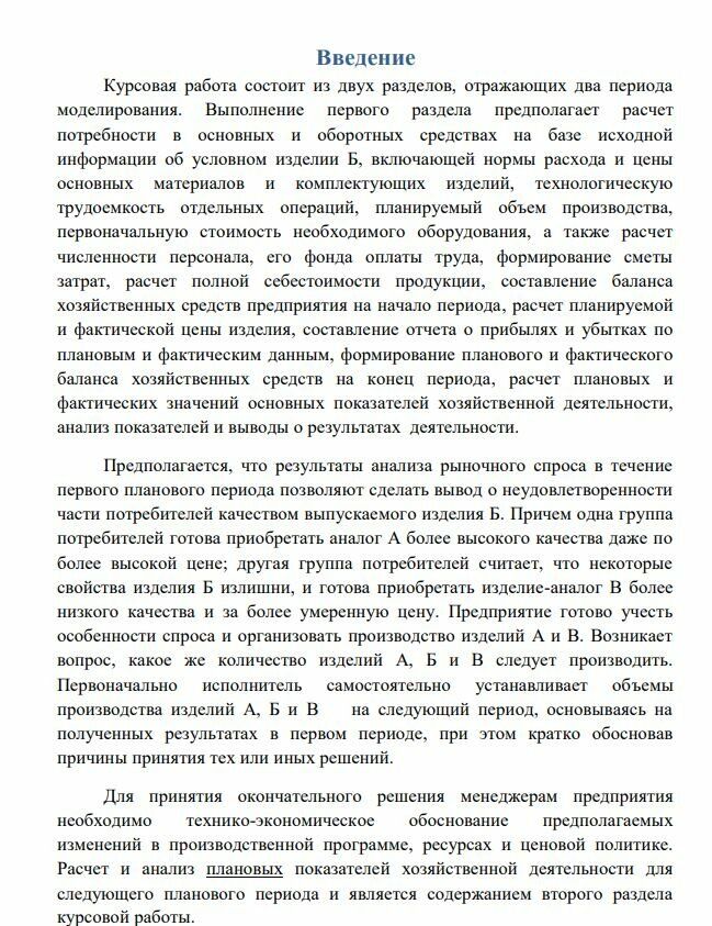 Данная работа представляет собой упрощенную расчетную модель деятельности предприятия, которая впоследствии может послужить основой для разработки бизнес-плана. В процессе выполнения работы составляются основополагающие документы: баланс хозяйственных средств предприятия на начало и конец периода хозяйственной деятельности, смета затрат на производство, калькуляция себестоимости, отчет о прибылях и убытках. Все документы так же, как и сам расчет, оформляются в упрощенной форме – не отражается, например, учет налога на добавленную стоимость, не учитываются некоторые статьи баланса, влияние инфляции и т.п. При планировании деятельности условного производственного предприятия отправным моментом служит исследование рынка предполагаемой продукции, определение потребности в товарах данного вида и необходимых в связи с этим ресурсов: оборудования, материалов, комплектующих изделий, количества работников, финансов и пр. Расчетные зависимости приведены в тексте задания.