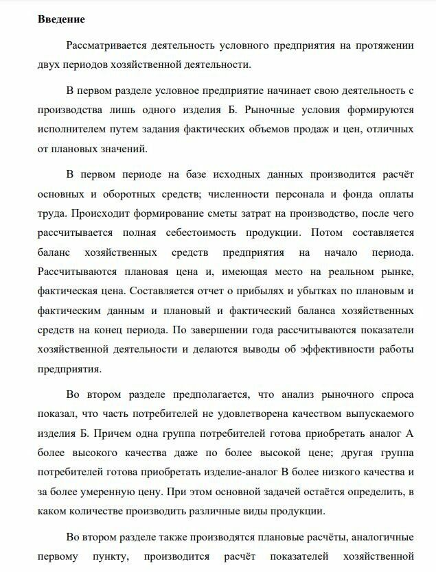 Курсовая работа отражает моделирование работы условного производственного предприятия. Назначение курсовой работы - изучить систему экономических показателей, характеризующих хозяйственную деятельность предприятия, и научиться взаимосвязи таких факторов, как технические характеристики изготавливаемых изделий, состояние производственных мощностей, качество используемых ресурсов, и т.п. В процессе работы составляются основные документы, такие как: баланс хозяйственных средств предприятия на начало и конец периода хозяйственной деятельности, смету затрат на производство, отчет о финансовых результатах. Все документы и расчеты подаются в упрощенной форме – не отражается учет НДС, не учитываются некоторые статьи баланса и т.п. После получения итогов работы условного предприятия и подсчёта показателей, следуют выводы о целесообразности данной производственной программы, эффективности её компонентов, возможных коррективах и исправлениях