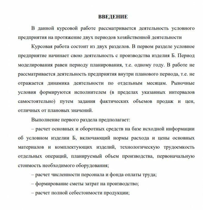 В данной курсовой работе рассматривается деятельность условного предприятия на протяжение двух периодов хозяйственной деятельности Курсовая работа состоит из двух разделов. В первом разделе условное предприятие начинает свою деятельность с производства изделия Б. Период моделирования равен периоду планирования, т.е. одному году. В работе не рассматривается деятельность предприятия внутри планового периода, т.е. не отражается динамика деятельности по отдельным месяцам. Рыночные условия формируются исполнителем (в пределах указанных интервалов самостоятельно) путем задания фактических объемов продаж и цен, отличных от плановых значений. Выполнение первого раздела предполагает: – расчет основных и оборотных средств на базе исходной информации об условном изделии Б, включающий нормы расхода и цены основных материалов и комплектующих изделий, технологическую трудоемкость отдельных операций, планируемый объем производства, первоначальную стоимость необходимого оборудования; – расчет численности персонала и фонда оплаты труда; – формирование сметы затрат на производство; – расчет полной себестоимости продукции;