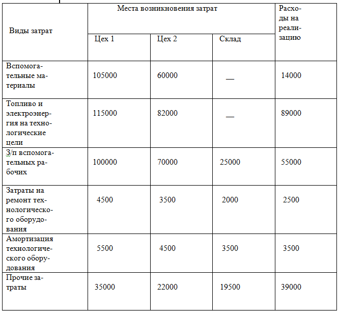 В течение отчетного года были произведены и реализованы изделия А, В, С в количестве 5 000 шт. каждое. Цены изделий А, В, С – 700, 550, 350 д. е. соответственно. При этом прямые переменные материальные затраты на изделие составили по А – 300, по В – 200, по С – 100 д.е./ шт. Заработная плата основных рабочих при изготовлении изделия А: по цеху 1: 80 д.е./шт, по цеху 2: 40 д.е./шт. изделия В: по цеху 1: 70 д.е./шт, по цеху 2: 30 д.е./шт. изделия С: по цеху 1: 30 д.е./шт, по цеху 2: 20 д.е./шт. Сумма постоянных материальных затрат составляет 75000 д.е., зар-плата управленческого персонала – 70000 д.е., зарплата обслуживающего персонала – 60000 д.е. Расходы на топливо и электроэнергию на общехозяй-ственные нужды – 50 000 д.е., амортизация и затраты на ремонт по общехо-зяйственным основным средствам – 100000 д.е. Прочие общехозяйственные расходы (почтовые и телеграфные расходы, расходы по найму и т. д.) явля-ются постоянными и составляют 300000 д.е. Данные по косвенным переменным затратам (д.е./год) приведены в таблице: