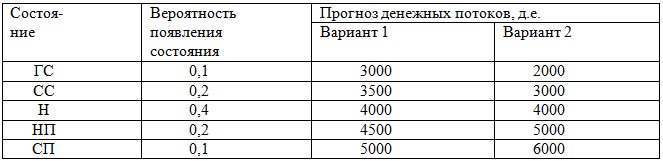 На рассмотрение предложены два инвестиционных проекта. По каж-дому из них сделан прогноз денежных потоков для следующих состояний экономики: нормальное (Н), глубокий спад (ГС), средний спад (СС), не-большой подъем (НП), существенный подъем (СП). Оцен