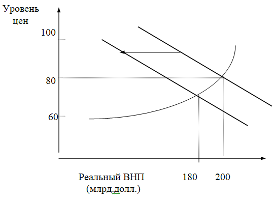 На рисунке представлены кривые совокупного спроса и совокупного предложения. Кривая совокупного спроса сдвигается влево.