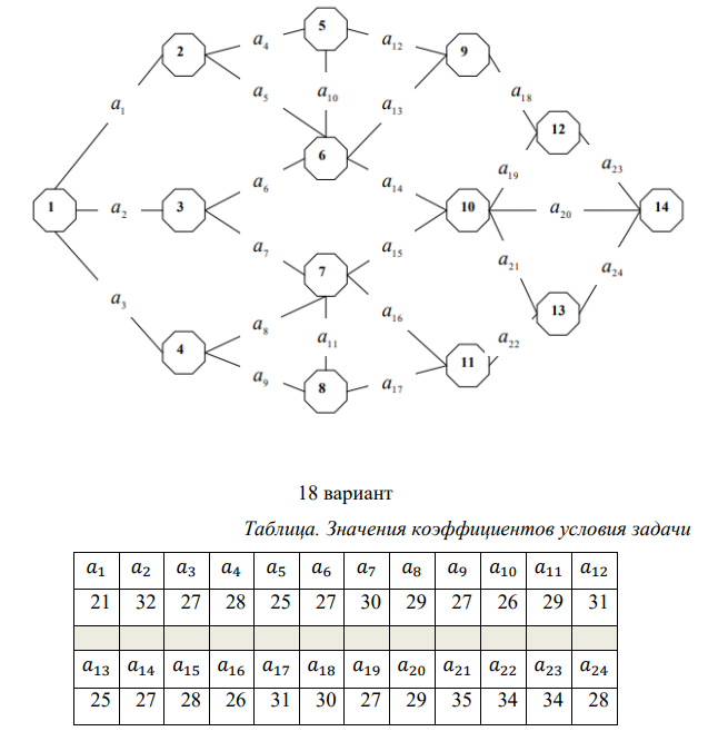 Транспортному предприятию требуется перевести груз из пункта 1 в пункт 14. На рисунке показана сеть дорог и стоимость перевозки единицы груза между отдельными пунктами. Определить маршрут доставки груза, которому соответствует наименьшие затраты.