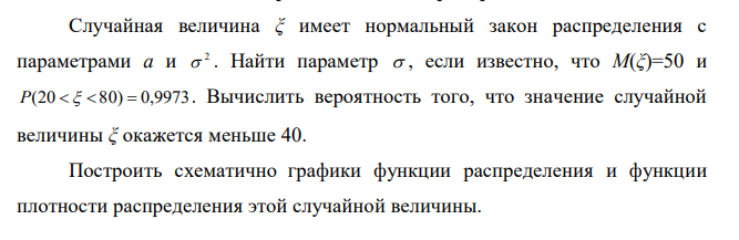 Случайная величина ξ имеет нормальный закон распределения с параметрами а и 2 . Найти параметр , если известно, что М(ξ)=50 и P(20 80) 0,9973 . Вычислить вероятность того, что значение случайной величины ξ окажется меньше 40. Построить схематично графики функции распределения и функции плотности распределения этой случайной величины.