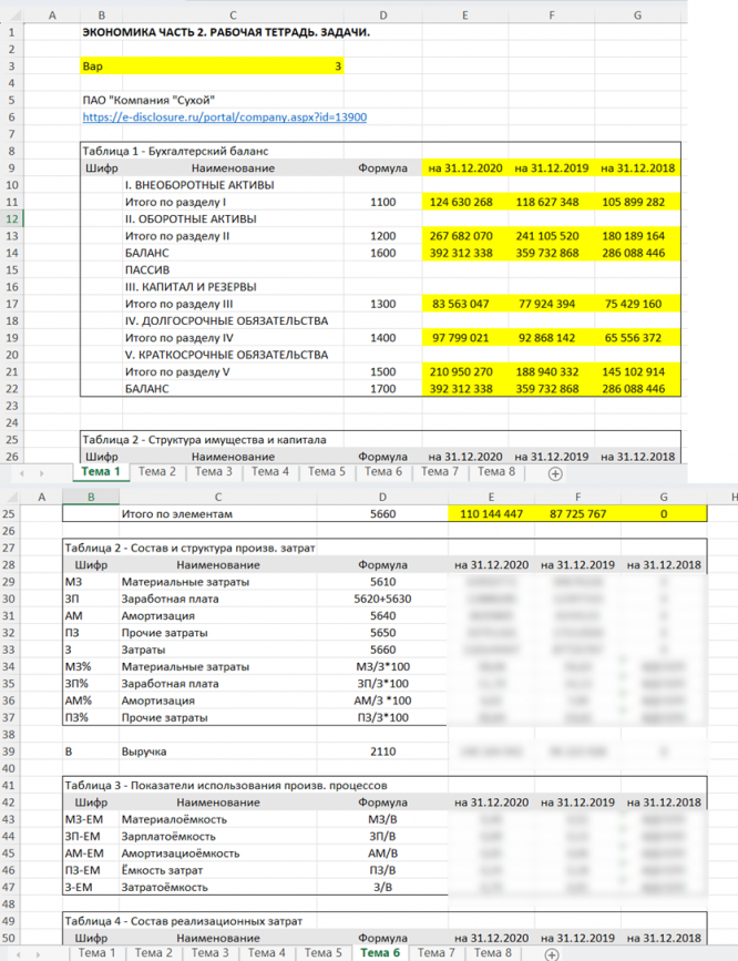 Решено все 8 тем в виде Excel-таблицы. Для варианта 3 (ПАО "Компания "Сухой"). Можно переделать под любой вариант, заменив данные в жёлтых ячейках, всё пересчитается автоматически.