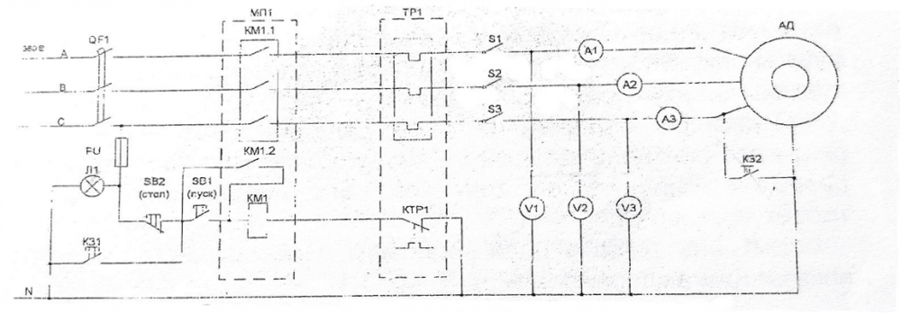 Исследовать на лабораторном стенде основные режимы работы АД, а именно: пуск АД; остановка АД; перегрузка АД и его защита; короткое замыкание на корпус АД; короткое замыкание в цепи управления магнитного пускателя; защита от понижения напряжения; дополнительная защита от неполнофазного режима работы.
