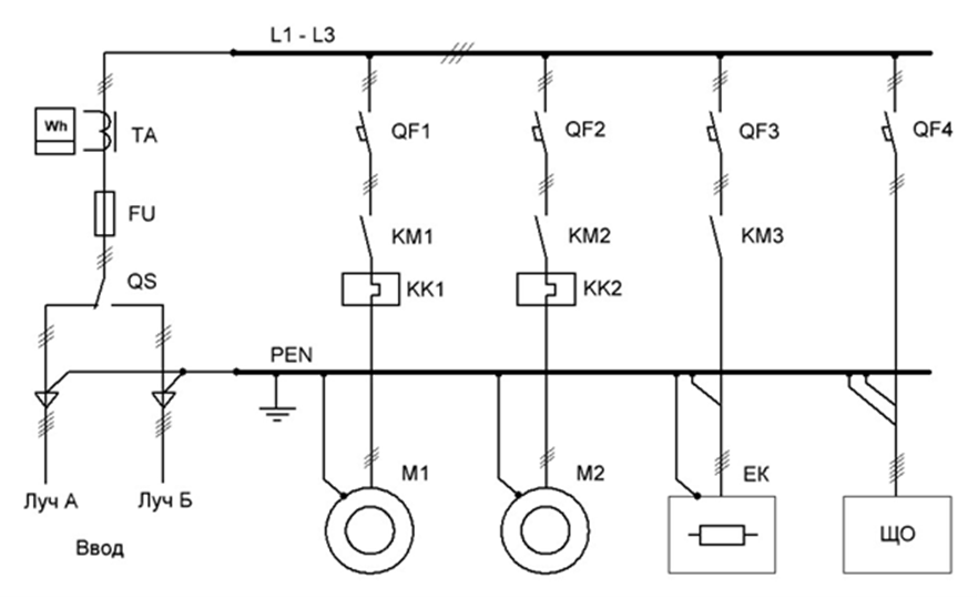 - в конце линий питания электродвигателей М1 и М2 – Iкз.min = 0,45 кА (до 15 кВт), Iкз.min = 0,95 кА (свыше 15 кВт);