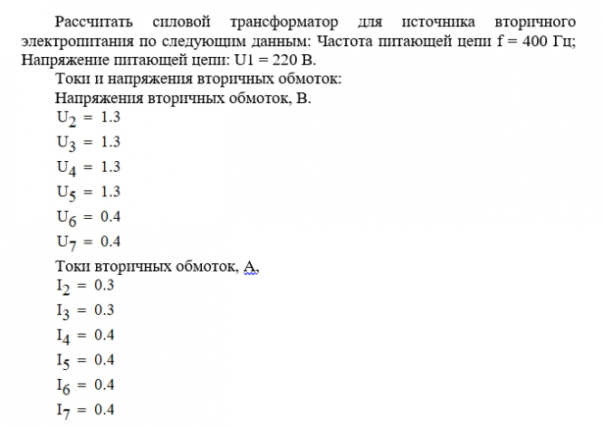 Рассчитать силовой трансформатор для источника вторичного электропитания по следующим данным: Частота питающей цепи f = 400 Гц; Напряжение питающей цепи: U1 = 220 В.