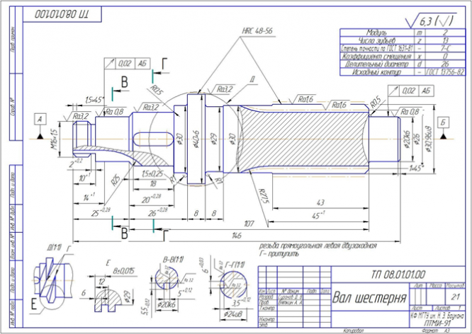 Изготовлена из конструкционной стали 40Х по ГОСТ 4543-2016, σв=610МПа и предназначена для передачи крутящих моментов посредством шестерни и зубчатого колеса в электрической тали. Деталь “Вал-шестерня” состоит из: двух подшипниковых шеек диаметром 20мм, также для установки зубчатого колеса при помощи шпоночного соединения предусмотрена поверхность диаметром d=24мм с закрытым шпоночным пазом глубиной h=3,5мм.