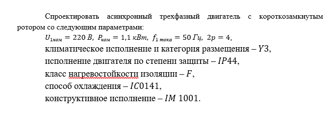 Спроектировать асинхронный трехфазный двигатель с короткозамкнутым ротором со следующим параметрами: