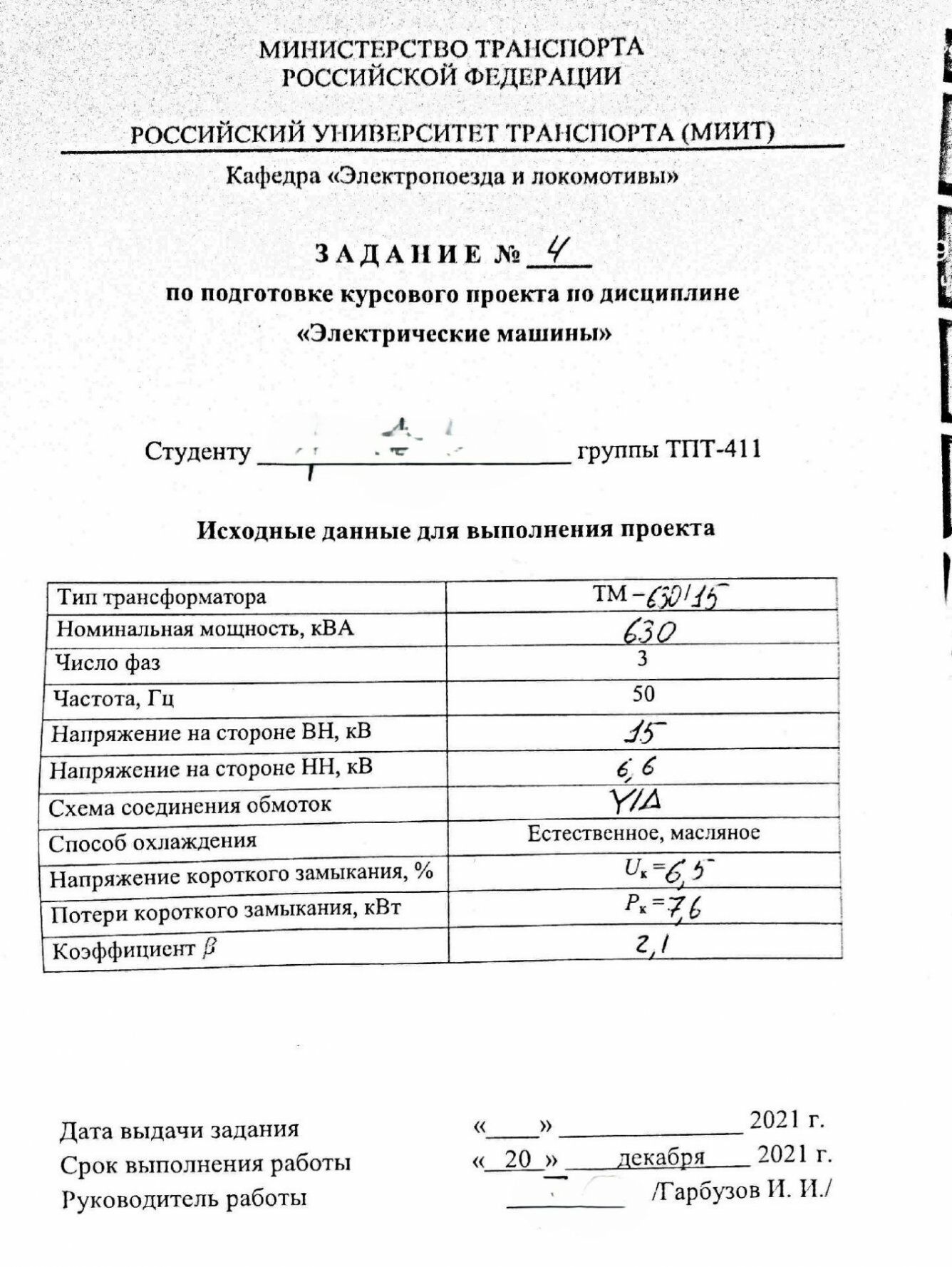 Электрические машины Расчёт силового трансформатора РУТ (МИИТ) Тип: ТМ- 630/15; 630кВА, фаз 3; 50Гц; ВН 15; НН 6.6; Схема Y/Delta; Uк = 6,5, Pк = 7.6, Коэф 2.1