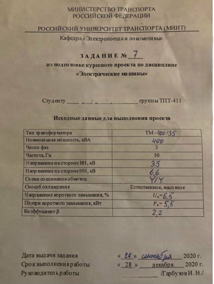 Электрические машины Расчёт силового трансформатора РУТ (МИИТ) Тип: ТМ- 400/35; 400кВА, фаз 3; 50Гц; ВН 35; НН 6.6; Схема Y/Y; Uк = 6,5, Pк = 5.5, Коэф 2.2