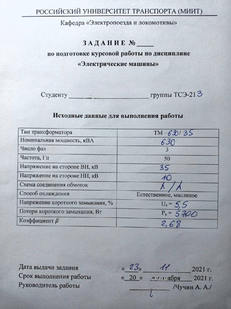 Электрические машины Расчёт силового трансформатора РУТ (МИИТ) Тип: ТМ- 630/35; 630кВА, фаз 3; 50Гц; ВН 35; НН 10; Схема Лямда/Лямда; Uк = 5,5, Pк = 57, Коэф 2,68