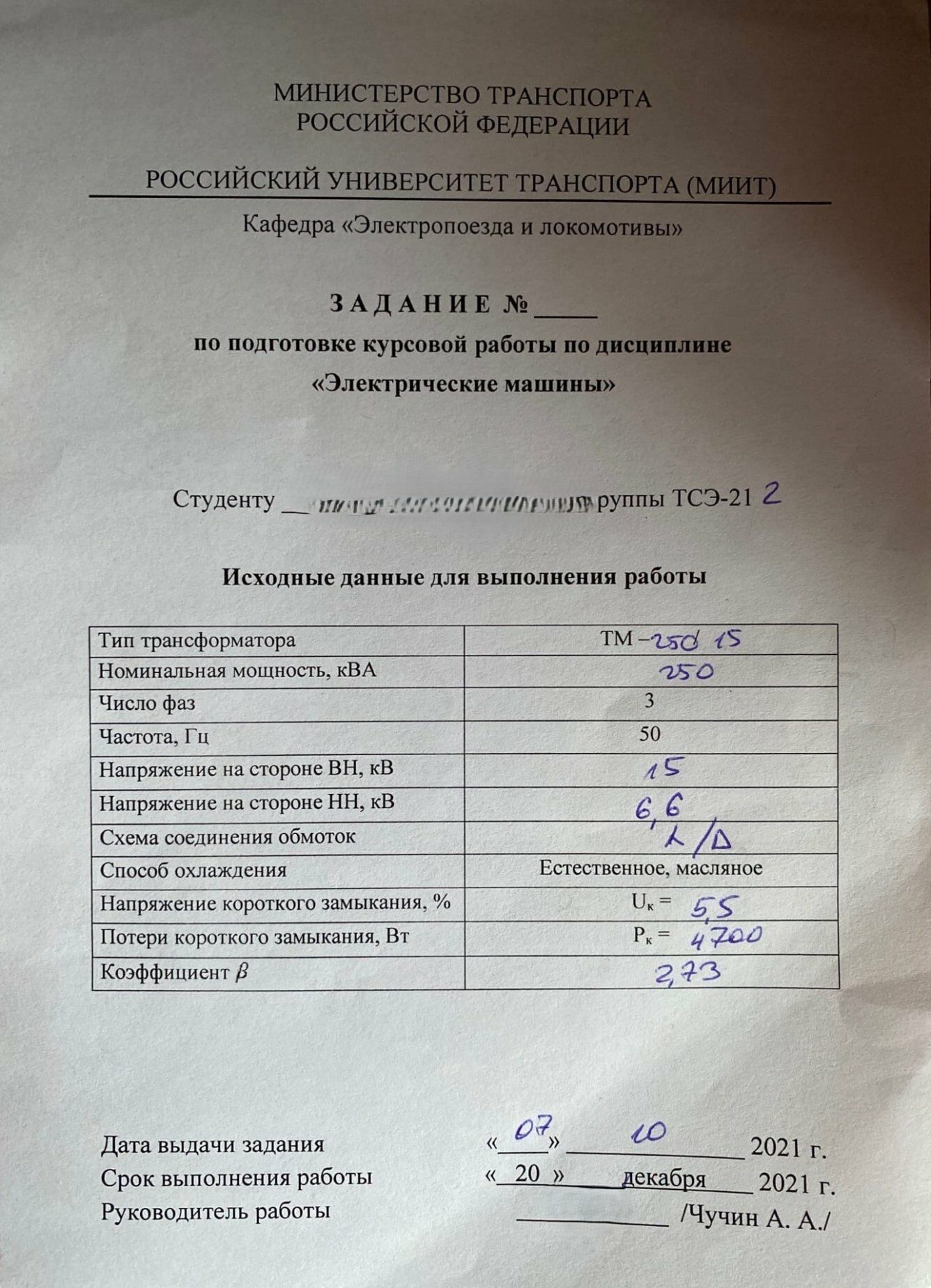 Электрические машины Расчёт силового трансформатора РУТ (МИИТ) Тип: ТМ- 250/15; 250кВА, фаз 3; 50Гц; ВН 15; НН 6,6; Схема Лямда/Delta; Uк = 5,5, Pк = 4700, Коэф 2,73