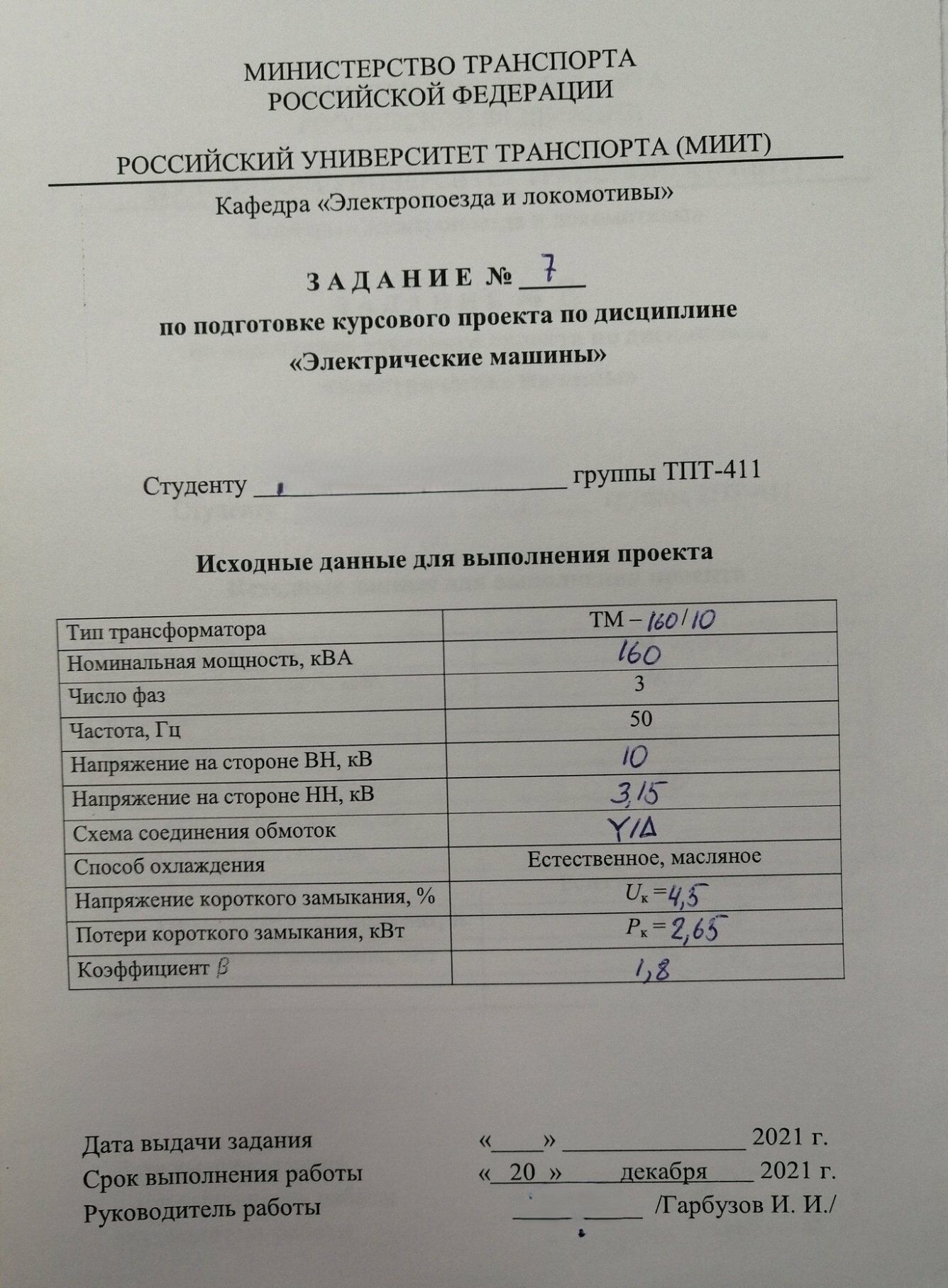 Для студентов РУТ (МИИТ) по предмету Электрические машиныРасчёт силового трансформатораРасчёт силового трансформатора
