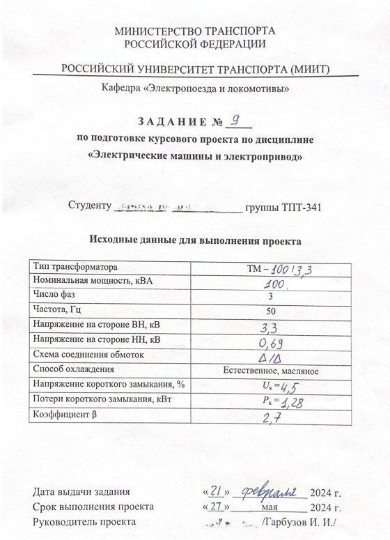 Электрические машины Расчёт силового трансформатора РУТ (МИИТ) Тип: ТМ- 100/3.3; 100кВА, фаз 3; 50Гц; ВН 3.3; НН 0.69; Схема Delta/Delta; Uк = 4,5, Pк = 1,28, Коэф 2.7
