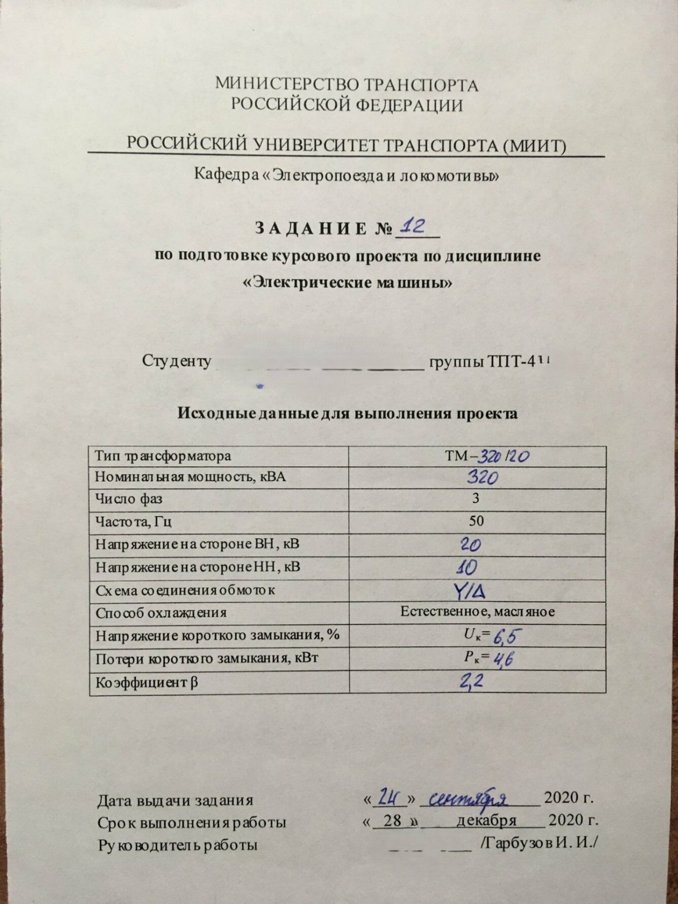 Электрические машины Расчёт силового трансформатора РУТ (МИИТ) Тип: ТМ- 320/20; 320кВА, фаз 3; 50Гц; ВН 20; НН 10; Схема Y/Delta; Uк = 6,5, Pк = 4,6, Коэф 2.2