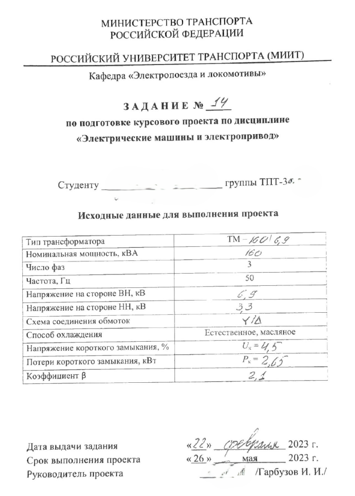 Электрические машины Расчёт силового трансформатора РУТ (МИИТ) Тип: ТМ- 160/6,9; 160кВА, фаз 3; 50Гц; ВН 6,9; НН 3,3; Схема Y/Delta; Uк = 4,5, Pк = 2.65, Коэф 2.1
