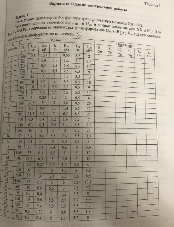 Зная номинальные значения и данные значения при ХХ и КЗ определить параметры трансформатора при соединении обмоток трансформатора по схеме.
