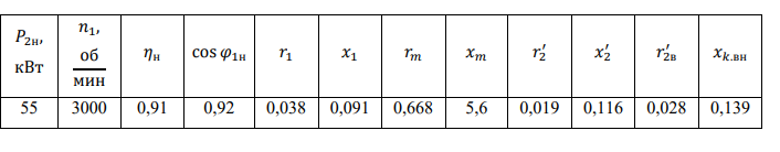 При выполнении РГР «Асинхронные двигатели» необходимо: 1. Рассчитать и построить рабочие характеристики трехфазного асинхронного двигателя (АД), т. е. зависимость скольжения 𝑆, тока статора 𝐼1, приведенного тока ротора 𝐼 ′ ; коэффициента полезного действия 𝜂 и коэффициента мощности cos𝜑1 от полезной мощности на валу Р2. 2. Определить номинальные величины и кратность максимального момента. 3. Рассчитать величину и кратность начального пускового тока и начального пускового момента.